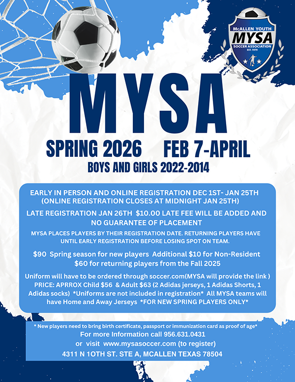 Spring Registration - Going on Now! Returning players that played in the Fall but did not pay for the Spring need to contact us at 956-631-0431. New players that *DID NOT* play in the Fall can reister online Here.![]() Please register early to ensure your child gets a spot . Any questions please call 956-631-0431. |